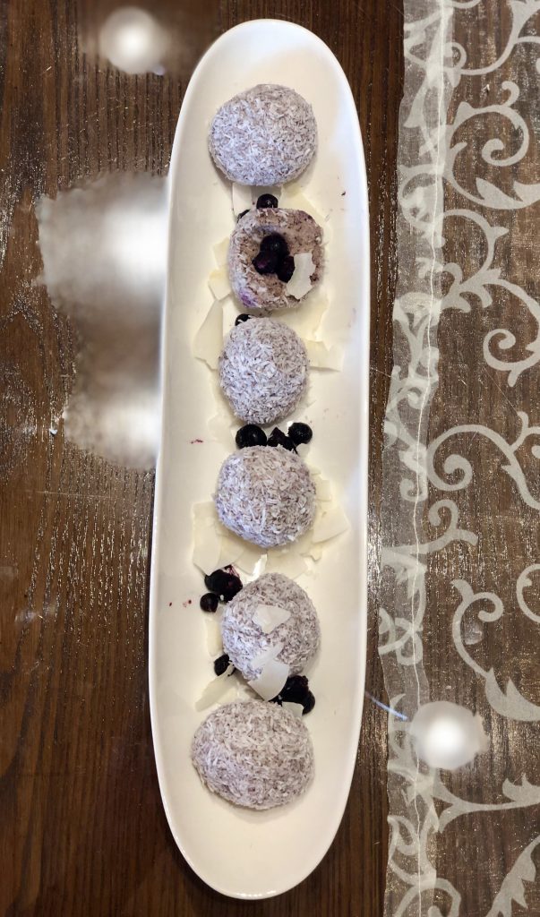 Kroglice so eden izmed mojih najljubših zajtrkov (ali prigrizkov). Po navadi jih pripravim zvečer za naslednji dan, da se čez noč sestavine še bolj sprimejo skupaj. Kljub nesladkemu izboru sestavin kokosove kroglice z borovnicami pridejo okusno sladkaste.