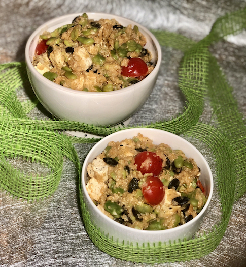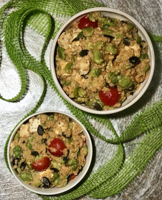 Kremna kvinoja z bobom, bučnimi semeni in s tofujem z baziliko je preprosto pripravljena jed za večerjo štirih oseb. Recept je brez glutena in veganski in bogat z beljakovinami, zato je ustrezen kot samostojna jed.