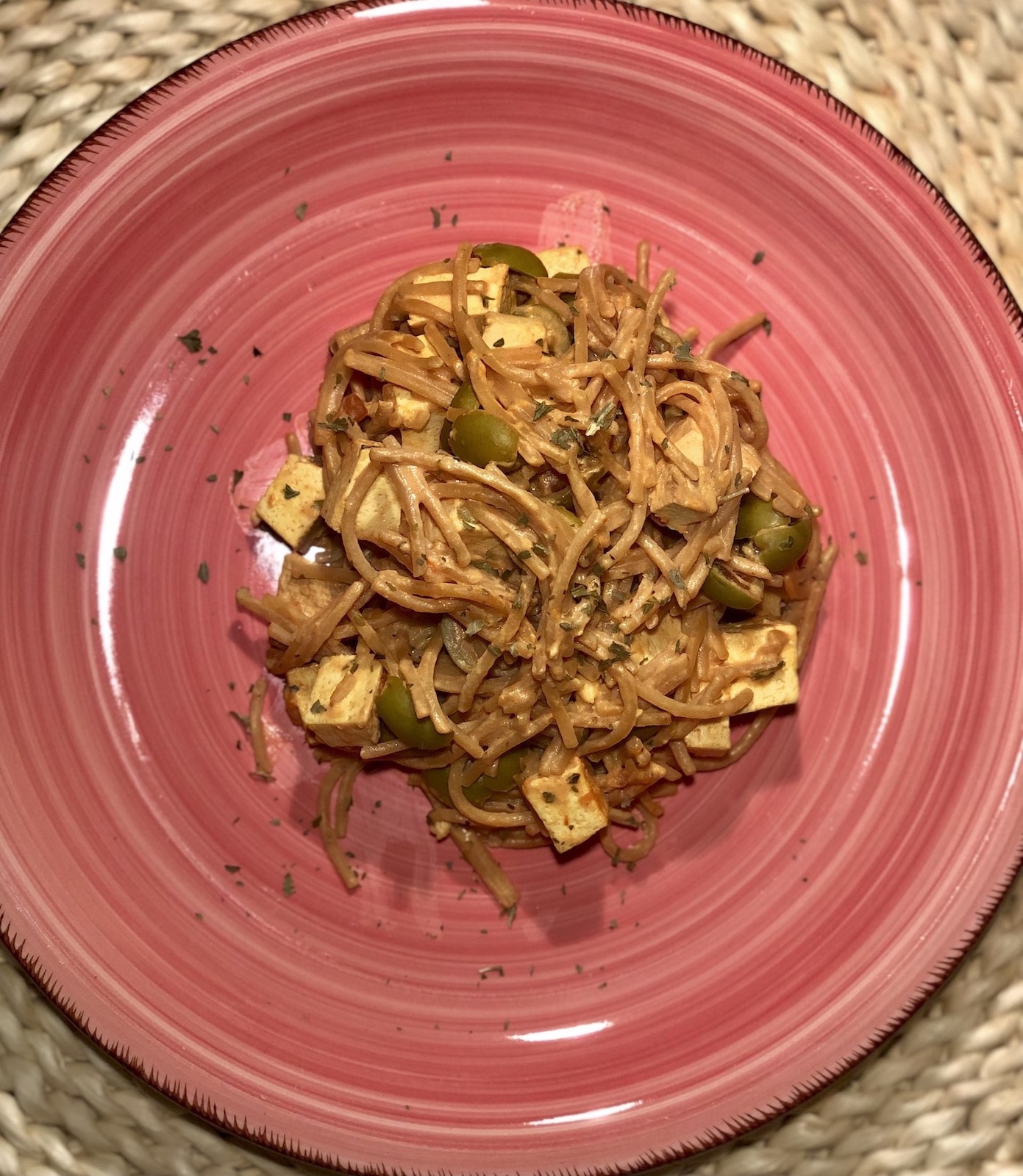 Lečini špageti s tofujem v sojino-paradižnikovi omaki