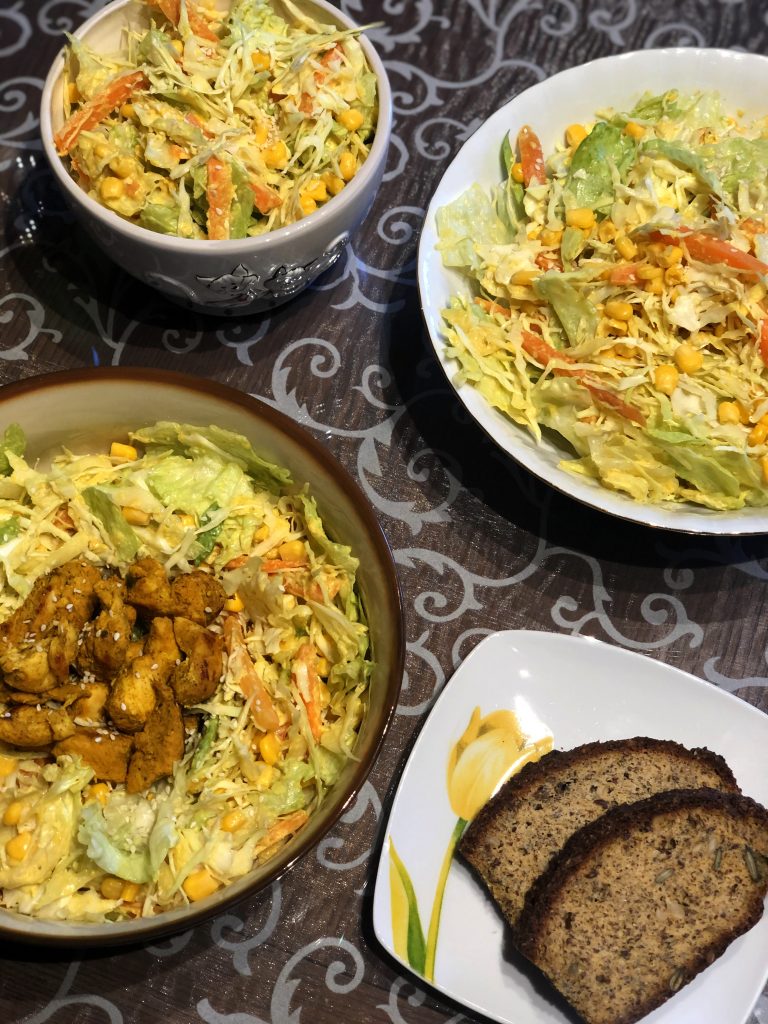 Še ena ideja za mešanico zelenjave z dodatkom mesa – solata ali t.i. solatna oz. zelenjavna skleda. Sestavine same po sebi niso nič posebnega, v kombinaciji pa se super obnesejo – sploh s hummusovim prelivom.