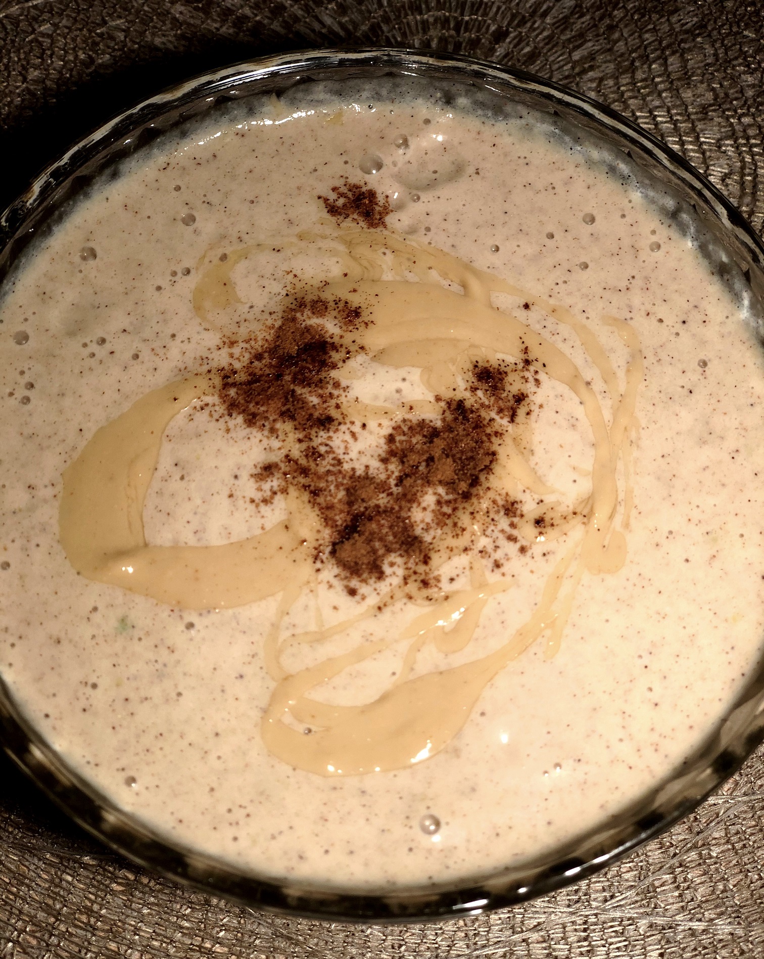 6. Smoothie prelijemo v posodo in okrasimo z arašidovim maslom ter s cimetom.
