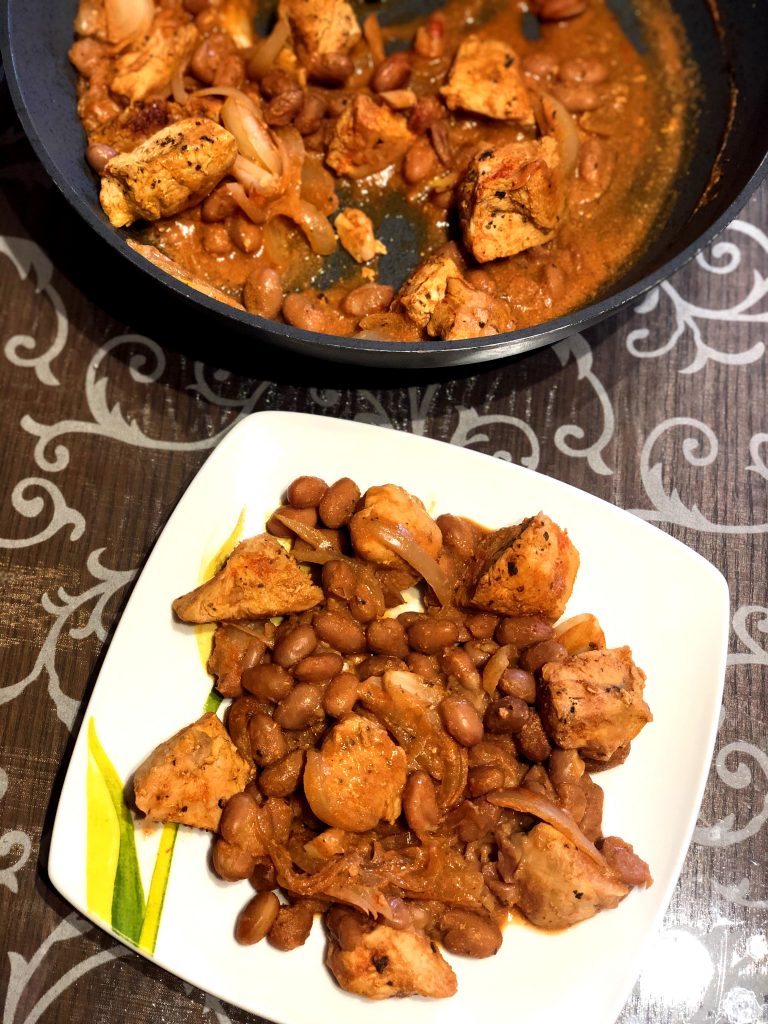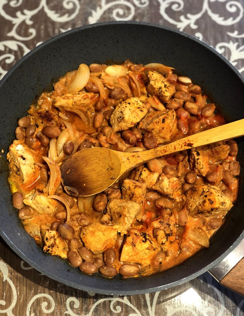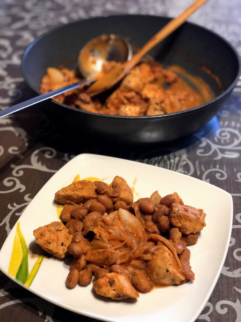I wanted cream sauce, but there was no kind of cream in the fridge, so I “invented” one myself. Soy drink seemed too liquid, but in combination with the tomato puree it reached new heights. Try the recipe for turkey in creamy tomato sauce with beans.