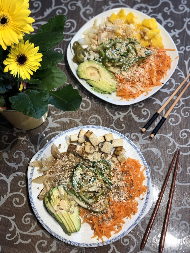 Vegetable bowl with smoked tofu and creamy peanut sauce is either a plate or a bowl. I love this kind of lunches lately as they offer a never ending list of opportunities to experiment with a combination of ingredients.